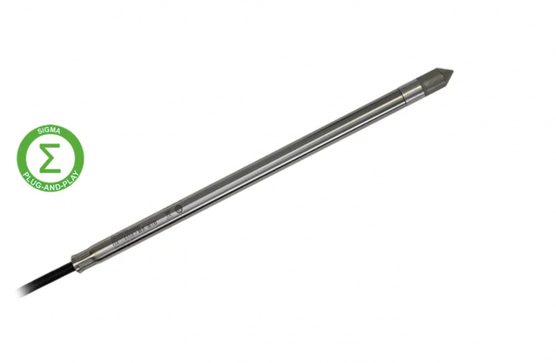 MOP301-T10F13K5L200PA23C0 Moisture in Oil Probe, Type: Remote probe, pressure-tight up to 20 bar (300 psi) and 180 °C (356 °F), Filter: Stainless steel, for flow < 1m/s, Cable length: 5 m (16.4 ft), Probe length: 200 mm (7.9”), Process connection: 1/2 IS