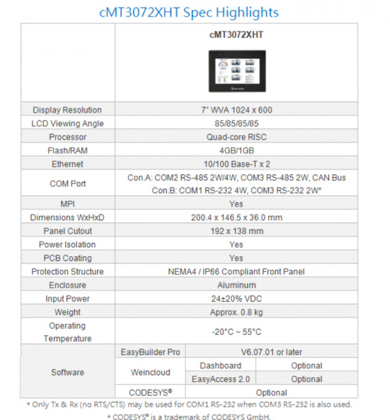 Weintek HMI 7" WVA LCD, 1024x600px, A35 1.5GHz, USB, 2xEthernet, 4GB/1GB 2xETHERNET -20...+55C cMT3072XHT Weintek