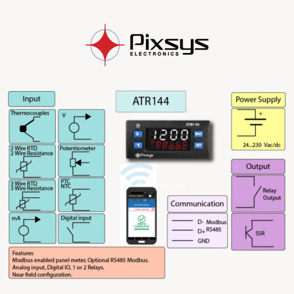 CONTROLLER TRIPLE SETPOINT 48X48 2AI, 2AO, 4DI/O,3RL, RS485 24VAC/DC, ATR244-23A-T Pixsys
