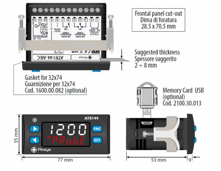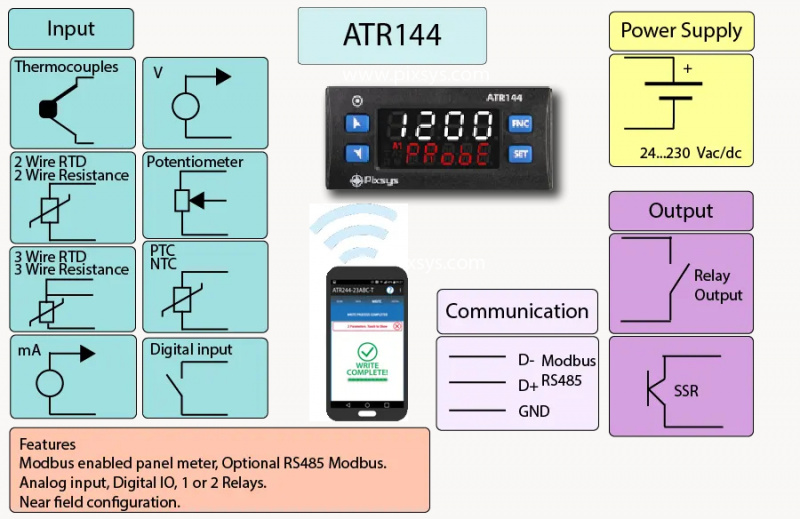 CONTROLLER MULTI-SETPOINT 32X74 4+5 digit 1AI-1DI/O-1RL-RS485, ATR144-ABC-T Pixsys