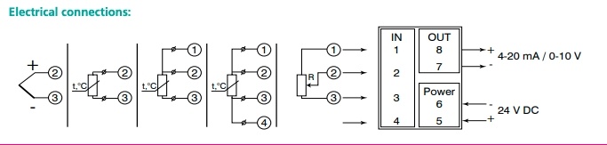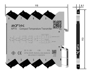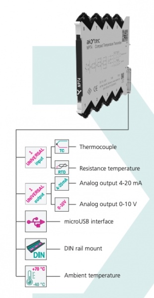 Slim (6.1 mm) temperature transmitter for DIN-rail. Input: RTD - Pt50, Pt100; TC - K, J, T, L, A, N, R, S, B. Output: 4-20 mA or 0-10V active